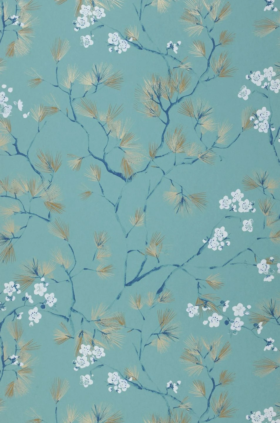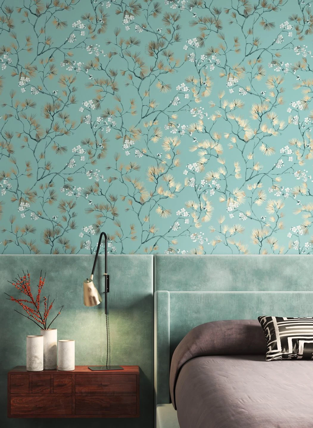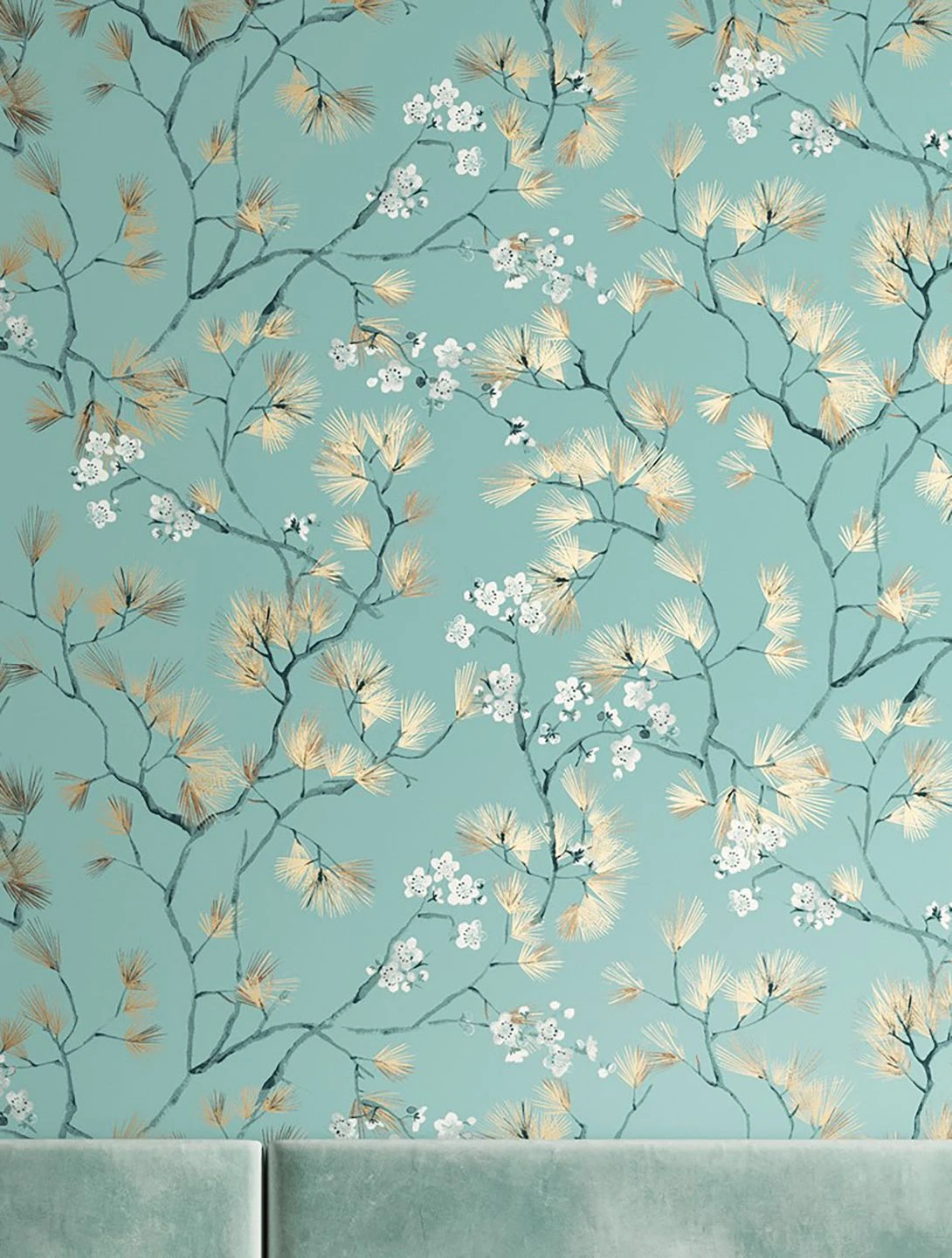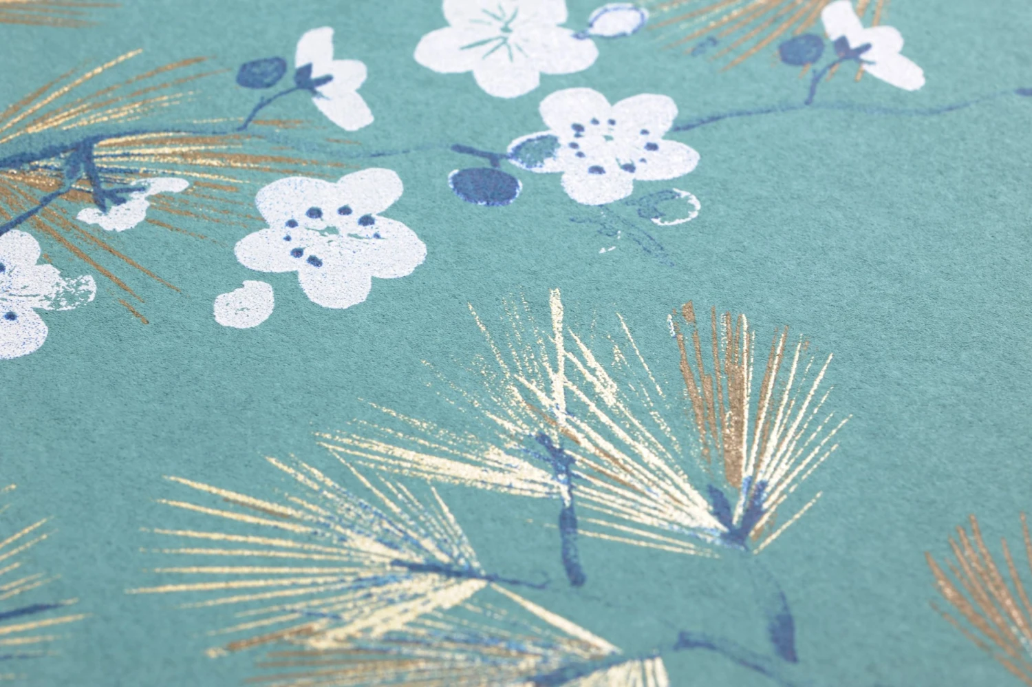 Filigran und fast zerbrechlich wirken die Zweige mit langen Nadeln und zarten Blüten in Grünblau, Lehmbraun, Weiß und mit Glanzlichtern in Mattgold auf dem minttürkisfarbenen Hintergrund. Luftige Leichtigkeit und fernöstlicher Zauber ziehen mit der Vliestapete „Makino“ in Ihr Zuhause ein und verströmen asiatische Gelassenheit. Ein toller Gesamteindruck entsteht mit Möbeln in einer der Musterfarben im geradlinigen asiatischen Stil.