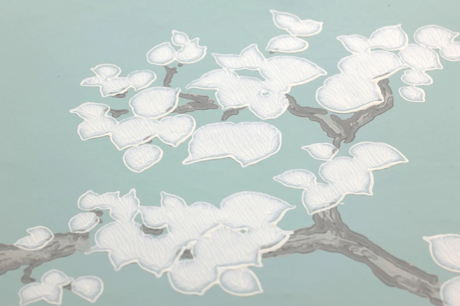 Sakura, die japanische Kirschblüte, die traditionell den Beginn des Sommerhalbjahres markiert und in dem fernöstlichen Inselstaat mit mehrtägigen Festen gefeiert wird, steht im Mittelpunkt dieser Papiertapete. Weiß wie Schnee heben sich die Blüten im Leimdruck vom pastelltürkisen Hintergrund ab. Die Tapete bildet die perfekte Ergänzung zum schlichten asiatischen Einrichtungsstil mit seinen klaren Linien.