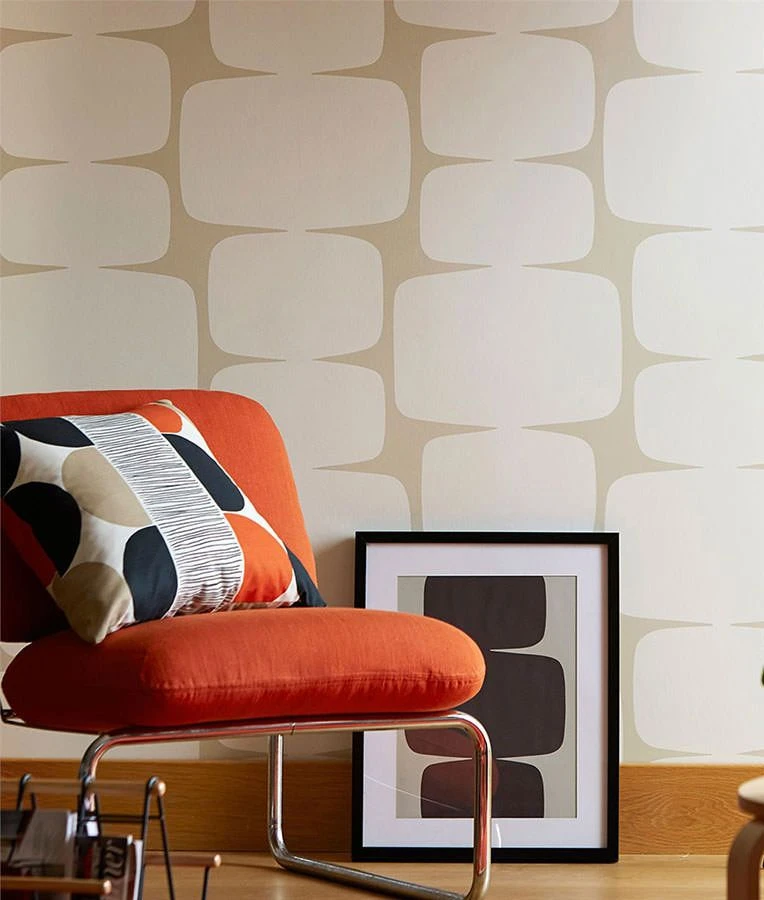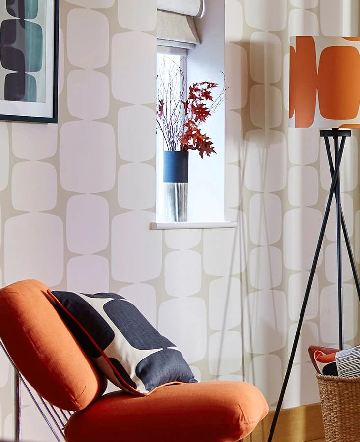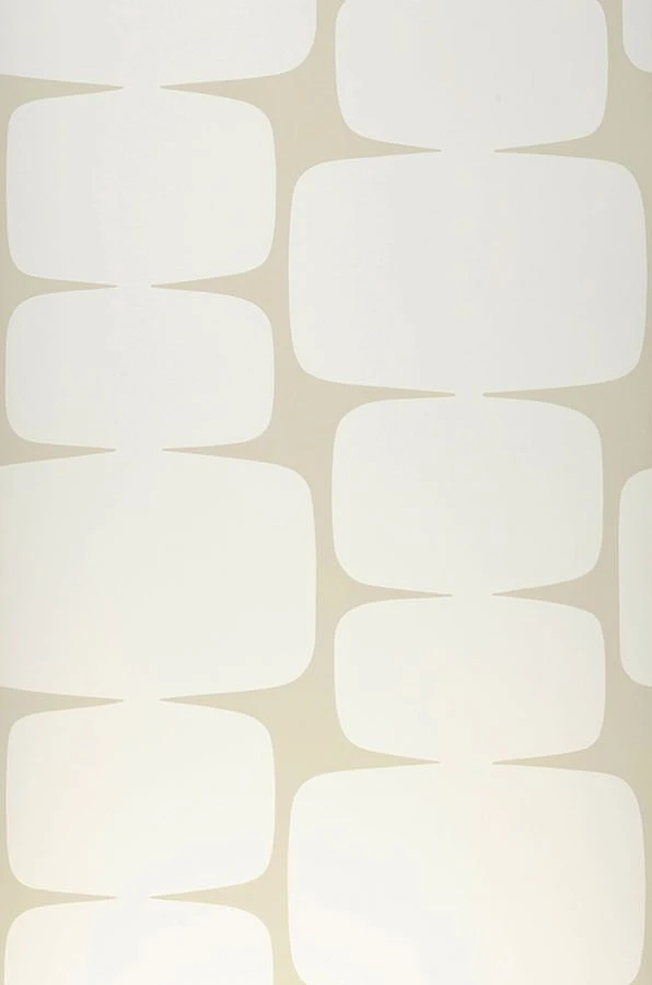 Große Rechtecke mit abgerundeten Seiten und Ecken sind wie Steinmännchen aufeinander gestapelt. Das Cremeweiß der Rechtecke und der hellgraubeigefarbene Zwischenraum des Untergrunds strahlen – ähnlich wie die bekannten Stapel von Steinen an Bergen und Wanderwegen – eine fast meditative Ruhe aus. Die 70er-Jahre-Ästhetik der Vliestapete findet eine schöne Entsprechung in hellen oder erdfarbenen Möbeln und den Vintage-Formen dieser Ära.
